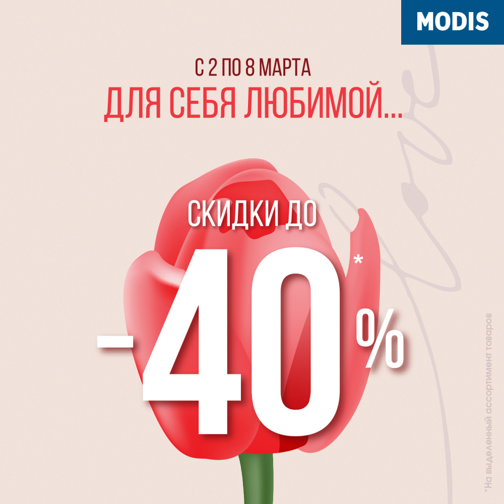 • Предложение действует во всех магазинах MODIS, кроме магазинов формата MODIS ДИСКОНТ.